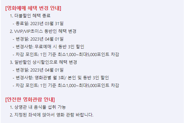 위에서 설명해드린 할인은 2023.05.01일 기준의 할인 정책으로, KT는 3월부터 할인 유형을 변경하였기 때문에 기존의 할인과 다를 것이므로 미리 숙지하고 영화를 보러 가야 합니다.