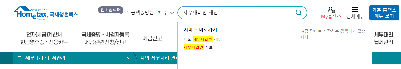 검색창에 "나의 세무대리인 해임"을 바로 검색해도 됩니다.
