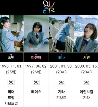 QWER(큐더블유이알)은 스트리머로 이루어진 걸그룹으로 구성원은 쵸단, 마젠타, 냥뇽녕냥, 그리고 이시연이 있습니다. 이들은 각자 드럼, 베이스, 기타, 보컬의 역할을 맡고 있습니다. 그들은 온라인에서 상당한 인기를 얻고 있으며, 이들의 활동은 성공적으로 평가될 것으로 보입니다. 멤버들의 팔로워 수를 합하면 약 1,000만 명에 달하며, 공식 데뷔 전에도 팬카페 회원 수가 이미 3만 명을 넘어섰습니다.